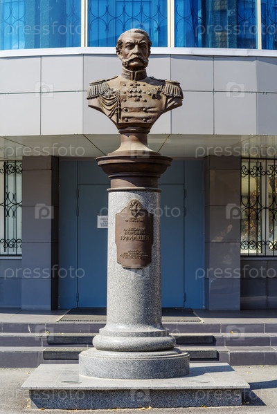 Оренбург, Россия - 29 августа 2021 г.: Памятник министру внутренних дел Российской империи генералу Тимашеву перед зданием УВД по Оренбургской области. Комсомольская улица