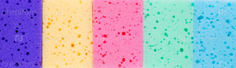 Разноцветные губки для чистки. Широкий баннер с синим, зеленым, розовым, желтым и фиолетовым цветами. Копировать пространство