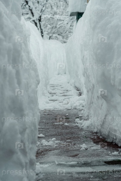 Снежный тоннель для прохода людей сделан лопатой. Много снега. Снежная зима в Европе. Глобальные проблемы изменения климата