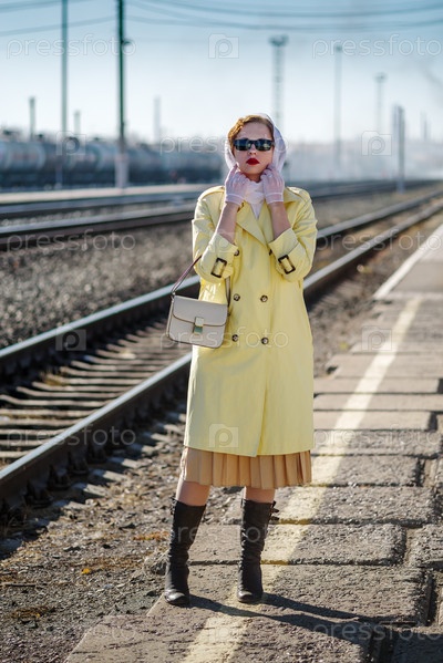 На перроне вокзала стоит молодая женщина в желтом плаще и темных очках. Снимок на открытом воздухе в стиле ретро