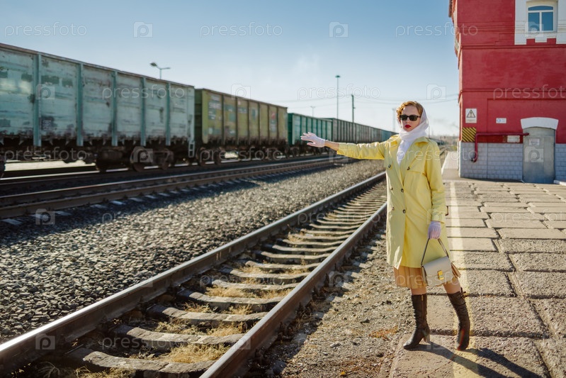 На перроне вокзала стоит молодая женщина в желтом плаще и темных очках. Снимок на открытом воздухе в стиле ретро