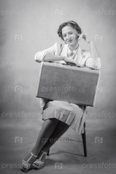 Молодая женщина, одетая в стиле ретро, сидит на стуле с чемоданом на коленях. Студийный черно-белый снимок