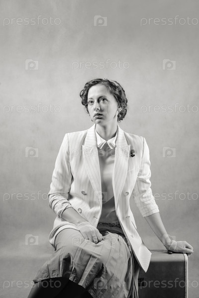 Молодая женщина, одетая в стиле ретро, сидит на чемодане. Студийный снимок