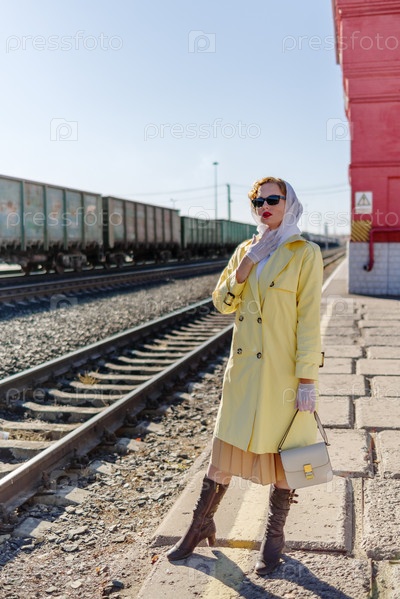 На перроне вокзала стоит молодая женщина в желтом плаще и темных очках. Снимок на открытом воздухе в стиле ретро