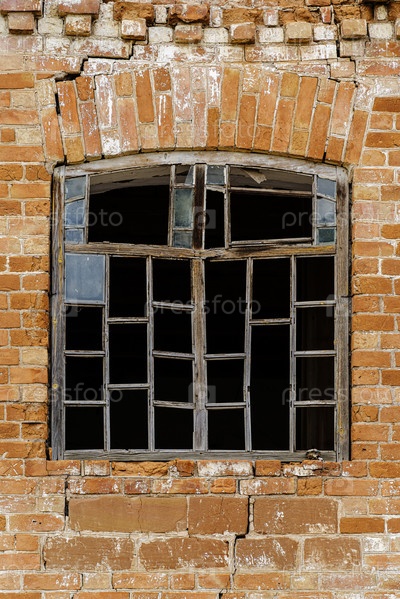 Деревянная оконная рама с разбитым стеклом в стене заброшенного кирпичного здания. Снимок сделан в селе Первокрасное Оренбургской области
