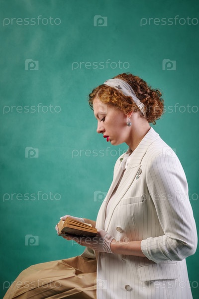 Сидящая молодая женщина, одетая в стиле ретро, читает книгу. Студийный портрет в профиль