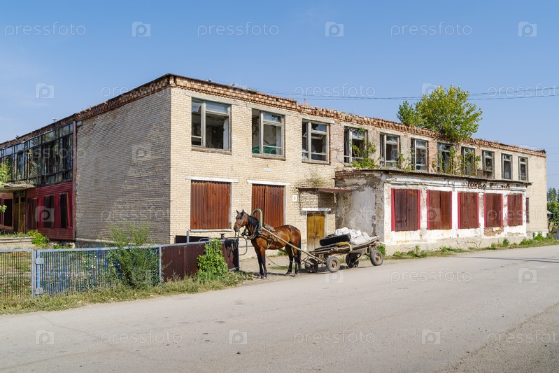 Лошадь, запряженная в телегу, возле заброшенного здания Дома культуры в русской деревне. Снимок сделан в России, в Челябинской области, в поселке Калининский