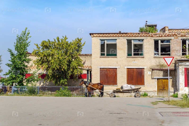 Лошадь, запряженная в телегу, возле заброшенного здания Дома культуры в русской деревне. Снимок сделан в России, в Челябинской области, в поселке Калининский