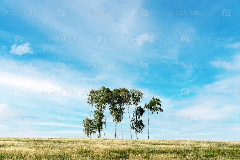 Небольшая березовая роща в летней степи. Снимок сделан в России, в Челябинской области