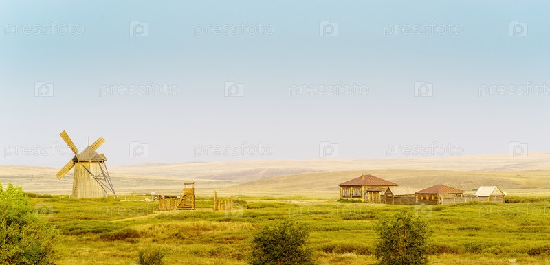 Аркаим, Челябинская область, Россия - 25 августа 2021 г.: Старая ветряная мельница и казачья усадьба на территории Аркаимского заповедника, рано утром