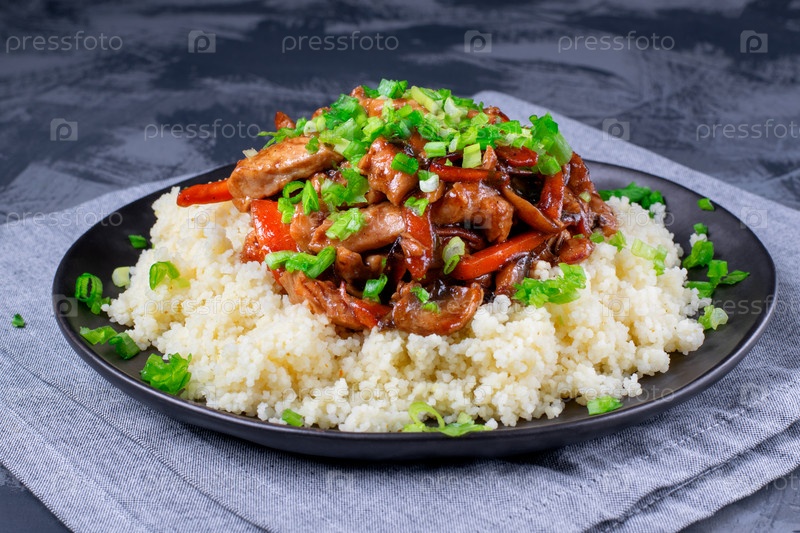 Смешайте обжаренные кусочки индейки с грибами, морковью и чесноком поверх кускуса. Аппетитная горячая еда с зеленым луком подается на сером столе