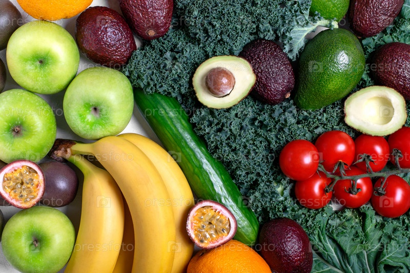 Ассорти из фруктов и овощей. Кале, авокадо двух сортов, помидоры черри и огурцы с одной стороны. Яблоко, банан, маракуйя и апельсин с другой. Здоровое питание