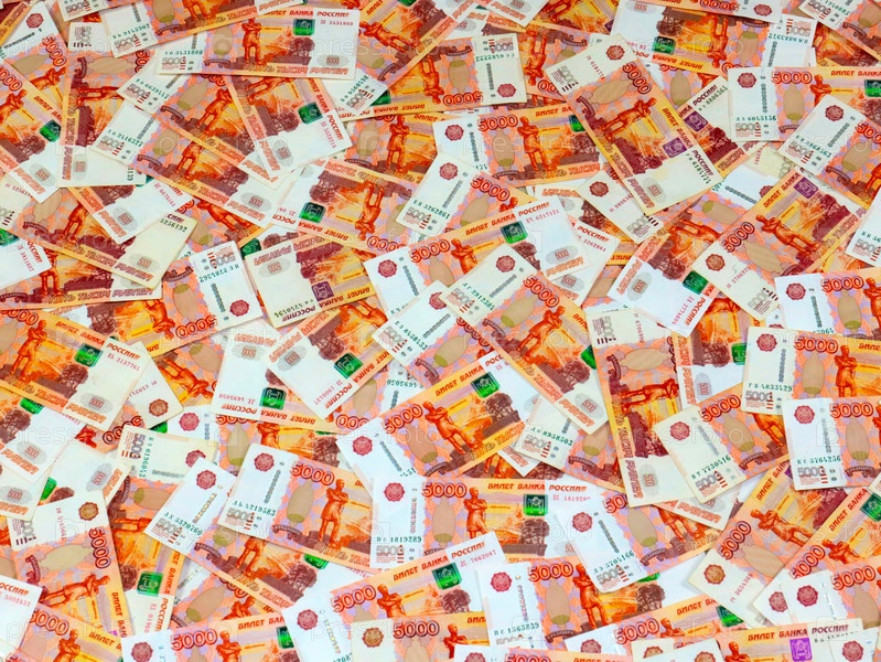 Пачка пятитысячных бумажных банкнот российские рубли как элемент нестабильной экономики