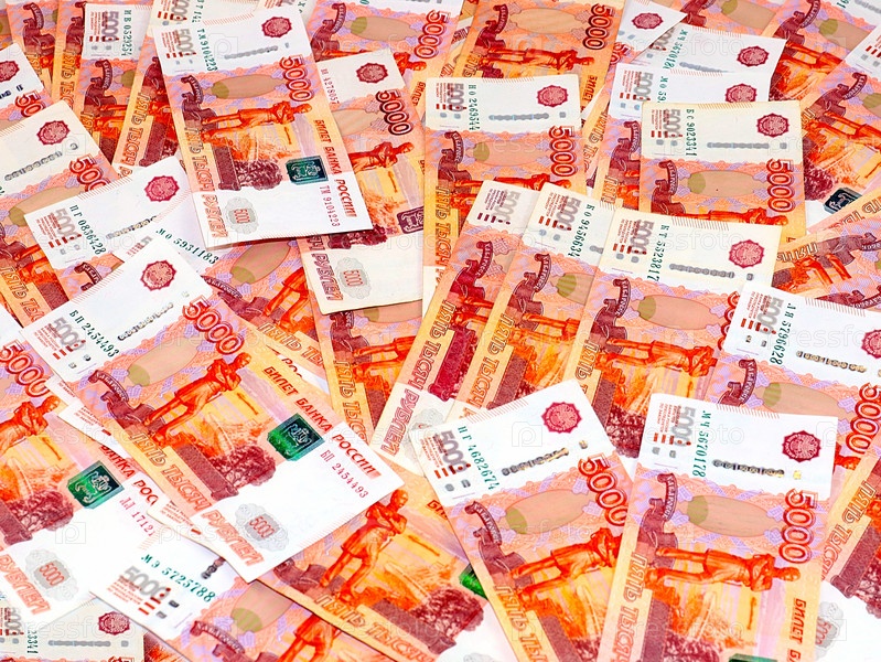 Пачка пятитысячных бумажных банкнот российские рубли как элемент нестабильной экономики