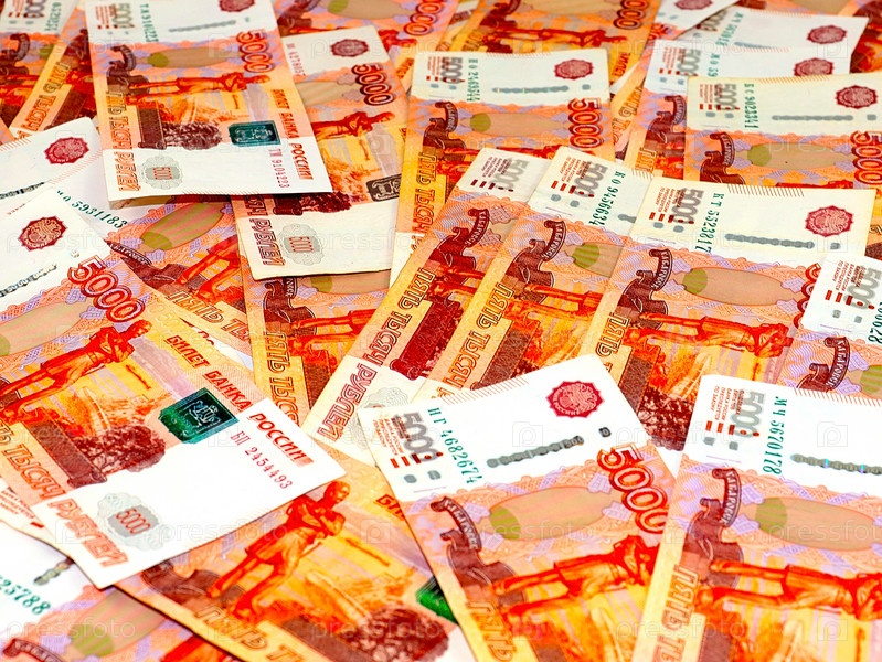 Пачка пятитысячных бумажных банкнот российские рубли как элемент нестабильной экономики