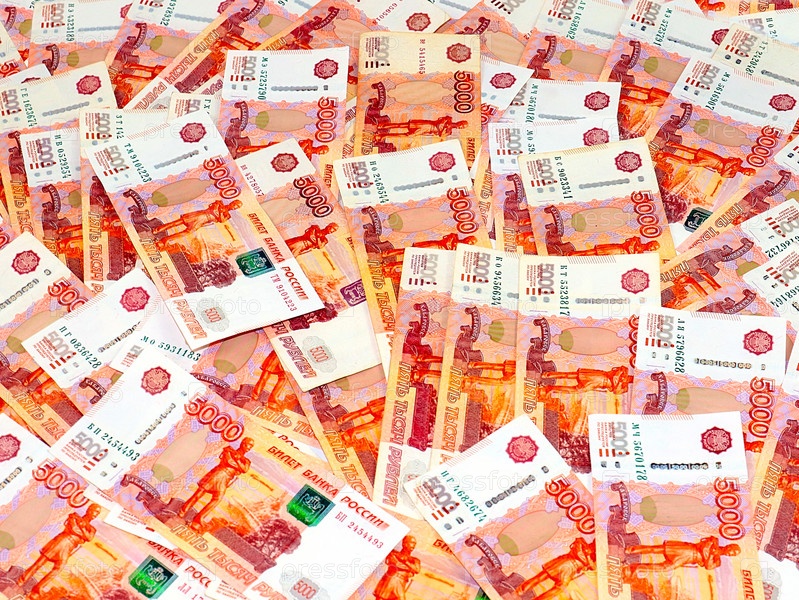 Пачка пятитысячных бумажных банкнот российские рубли как элемент нестабильной экономики
