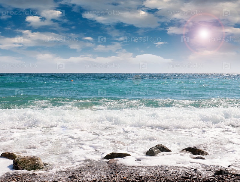Галечный морской пляж и облачное летнее небо как место для активного отдыха