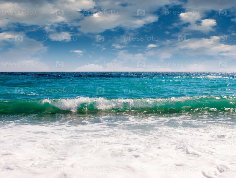 Галечный морской пляж и облачное летнее небо как место для активного отдыха