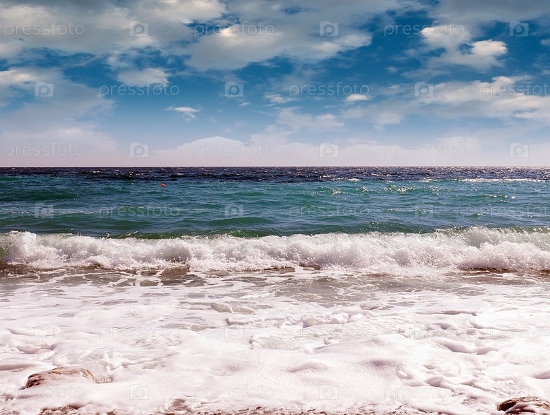 Галечный морской пляж и облачное летнее небо как место для активного отдыха