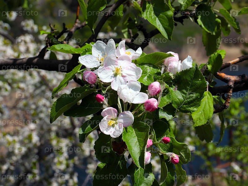 Прекрасные весенние белые цветы на ветвях яблони