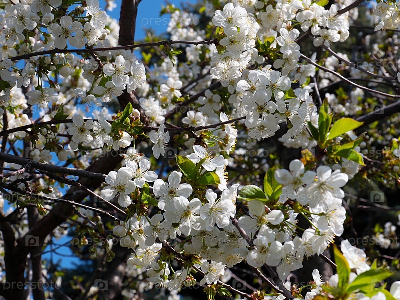 Прекрасные весенние белые цветы на ветвях яблони