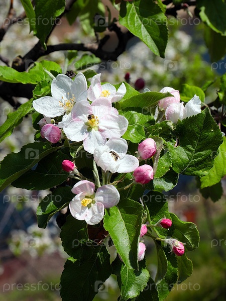 Прекрасные весенние белые цветы на ветвях яблони