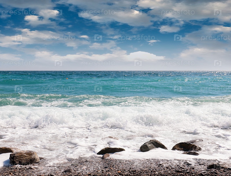 Галечный морской пляж и облачное летнее небо как место для активного отдыха
