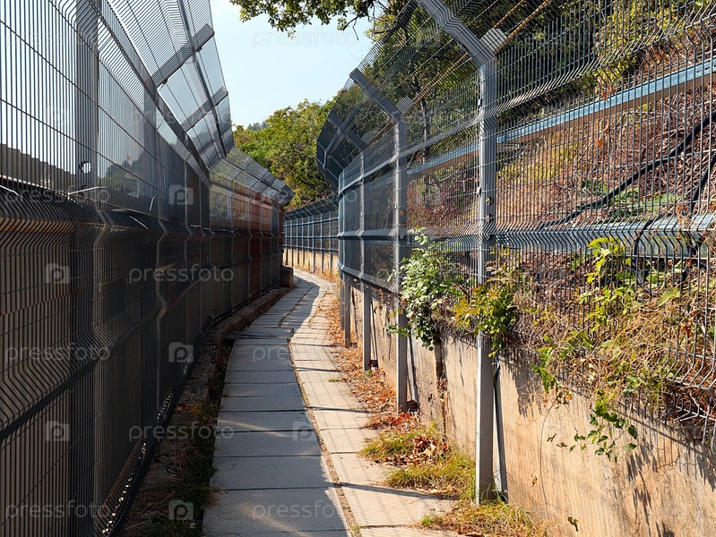 Пешеходный переход огорожен бордюрной металлической решеткой