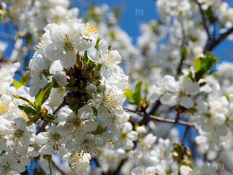 Прекрасные весенние белые цветы на ветвях яблони