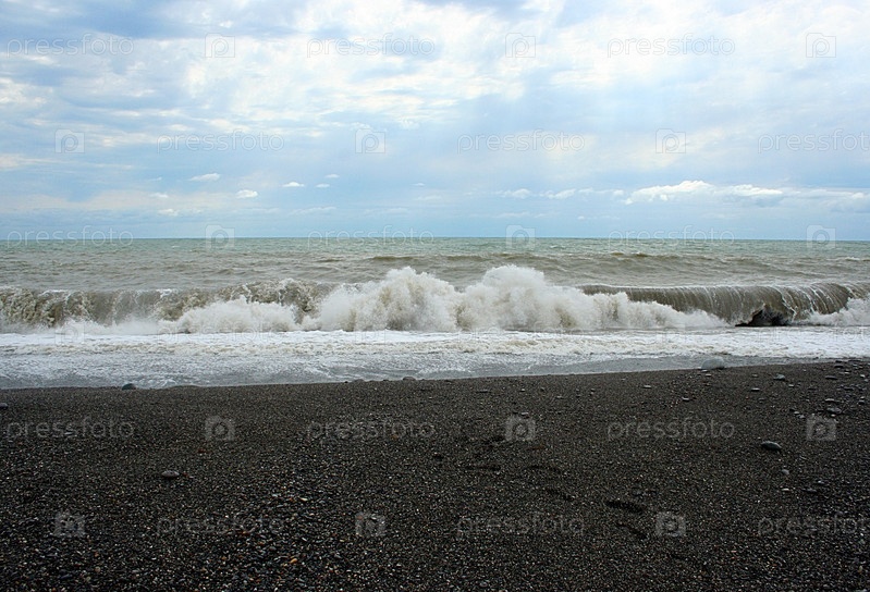 Опасные волны во время морского шторма под облачным небом