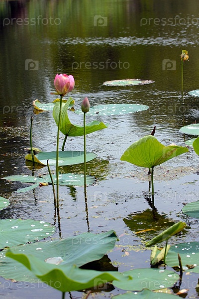 Красивые водяные лилии на поверхности лесного озера