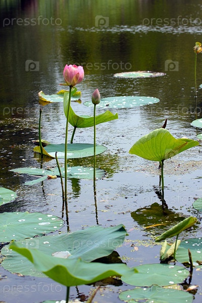 Красивые водяные лилии на поверхности лесного озера