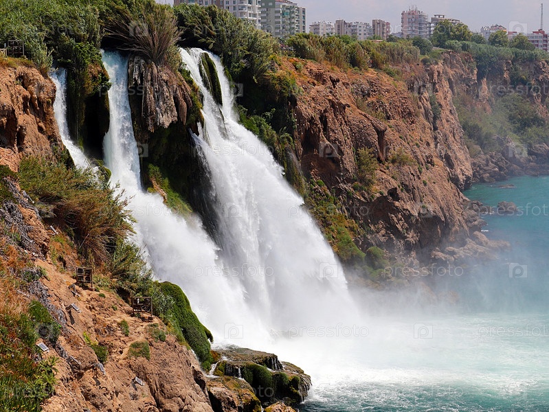 Красивый водопад Верхний Дуден в жилом районе Лара в Анталии, Турция