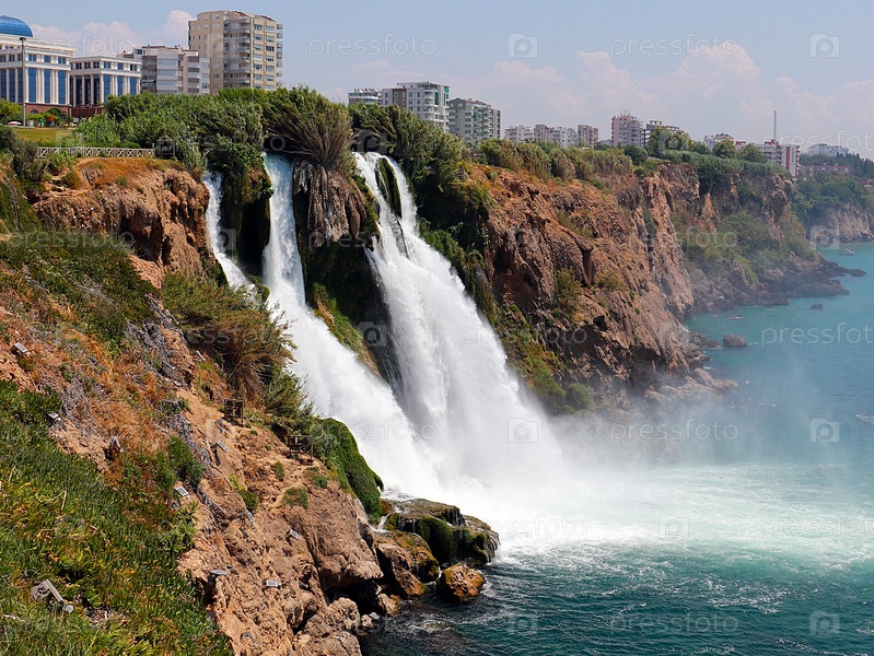 Красивый водопад Верхний Дуден в жилом районе Лара в Анталии, Турция