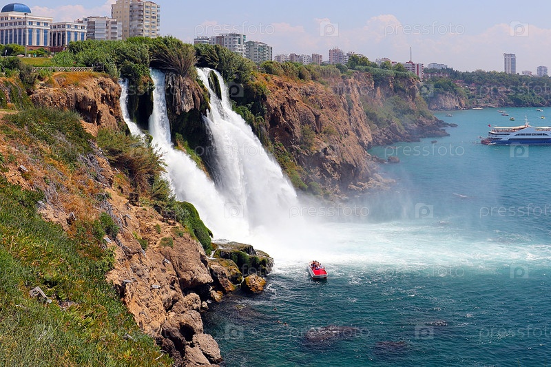 Красивый водопад Верхний Дуден в жилом районе Лара в Анталии, Турция