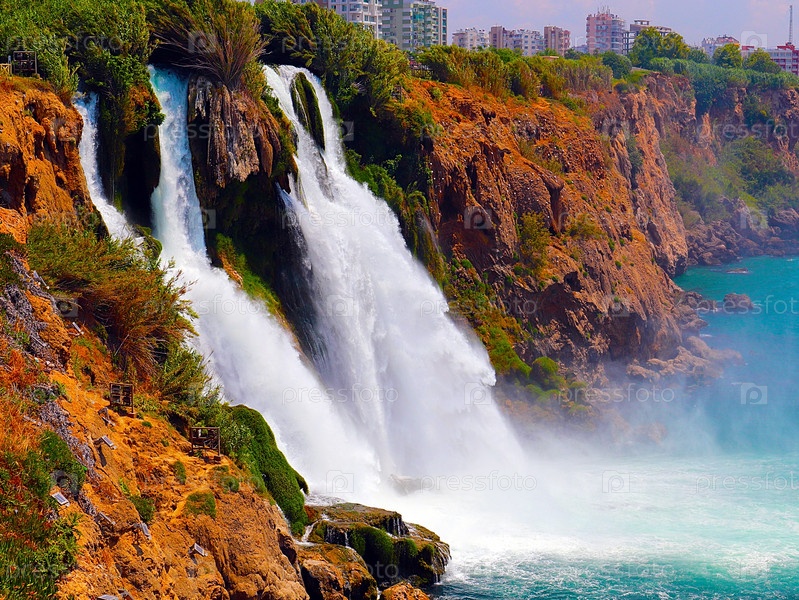 Красивый водопад Верхний Дуден в жилом районе Лара в Анталии, Турция
