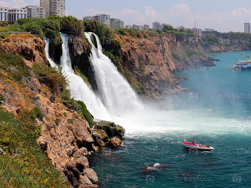 Красивый водопад Верхний Дуден в жилом районе Лара в Анталии, Турция