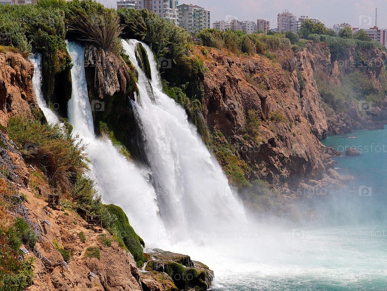 Красивый водопад Верхний Дуден в жилом районе Лара в Анталии, Турция