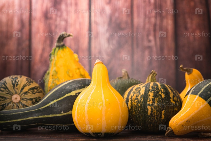 Тыквы разных форм и размеров на деревянном столе, пространство для копирования