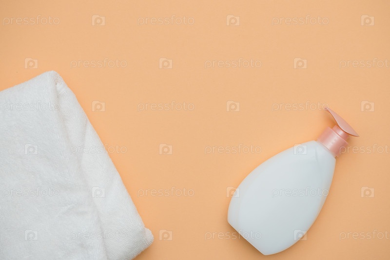 Бутылка белого лосьона для тела и белые банные полотенца на оранжевом фоне, вид сверху. Тема чистоты и гигиены