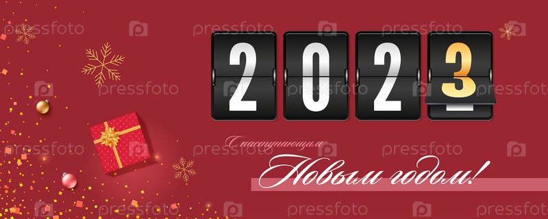 Поздравления с новым 2023 годом украшены подарочными коробками, снежинками и елочными шарами. Механический обратный отсчет показывает прошедшее время. Шаблон для поздравительной открытки