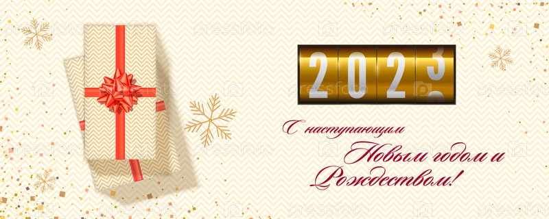 Поздравления с новым 2023 годом украшены подарочными коробками и снежинками. Яркий геометрический фон. Механический обратный отсчет показывает прошедшее время. Шаблон для поздравительной открытки