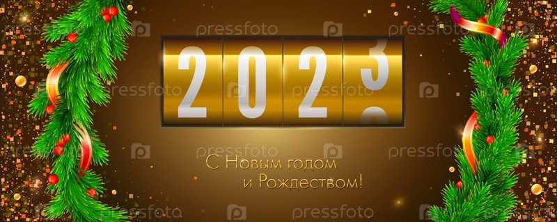 С новым 2023 годом. Украшенная открытка с еловыми ветками. Механический обратный отсчет показывает прошедшее время. Шаблон для поздравительной открытки