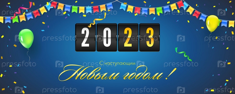 С новым 2023 годом. Поздравительная открытка с вымпелами, конфетти и воздушными шарами. Механический обратный отсчет показывает прошедшее время. Шаблон для поздравительной открытки