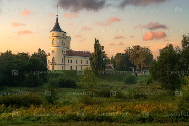 Вид на замок российского императора Павла I-Мариенталя (крепость БИП) с реки Славянка, Павловский в солнечное летнее утро, Санкт-Петербург, Россия