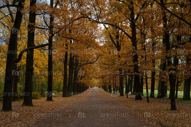 Вид на аллею Рамп, усыпанную опавшими листьями, в Екатерининском парке Царского Села в осенний день, Пушкин, Санкт-Петербург, Россия