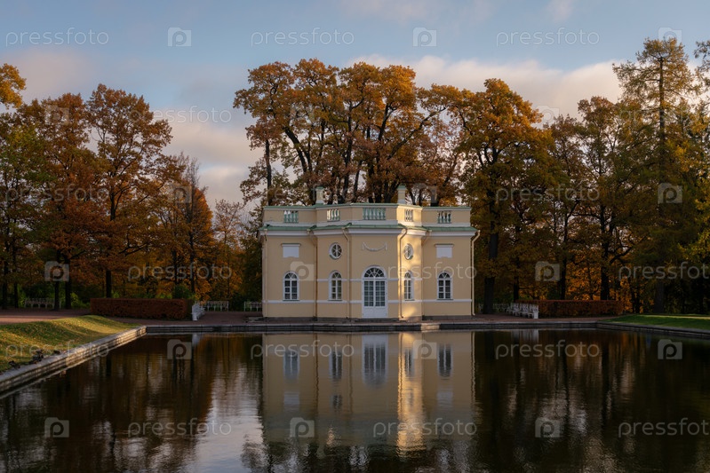 Вид на павильон Верхняя ванна с отражением в Зеркальном пруду Екатерининского парка в Царском Селе в солнечный осенний день, Пушкин, Санкт-Петербург, Россия