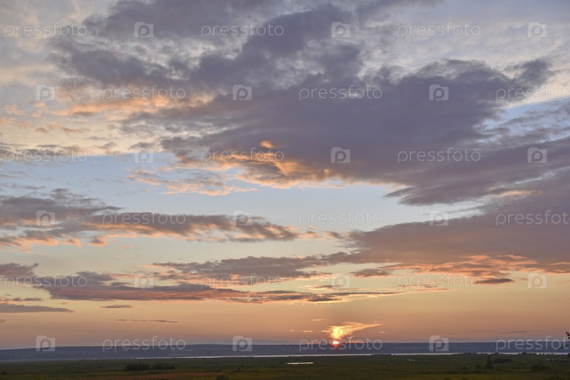 Горизонт заката с красными облаками летом в поле