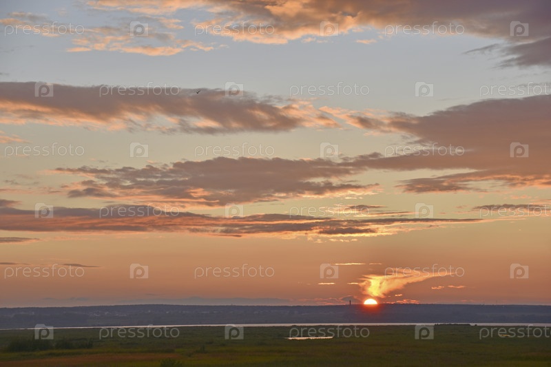 Горизонт заката с красными облаками летом в поле