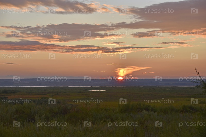 Горизонт заката с красными облаками летом в поле